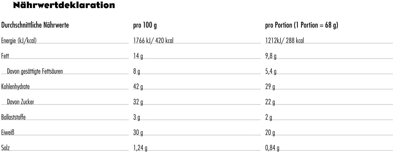 - Valeur énergétique kJ/kcal : 1212 kJ / 288 kcal