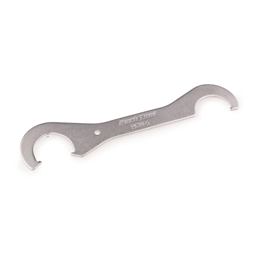 Clé à crochet double face. D’un côté avec un seul crochet (40 mm de diamètre), de l’autre siete crochet avec trois broches pour un engagement plus sûr dans l’anneau de blocage (46 mm de diamètre).